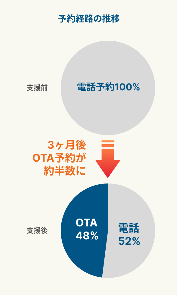 M&Aによるオーナー変更を機に、新オーナーの方針で販売方法の多角化を推進しました。まずはOTA販売の設定を行い、オンライン経由での集客を可能にしました。加えて、フロントオペレーションの適正化を図るため、必要な各種システムの導入提案と設定を実施し、スタッフのシフトやマンパワー配分も見直しました。これにより、業務の効率化とサービス品質の安定化を両立する体制を構築しました。
